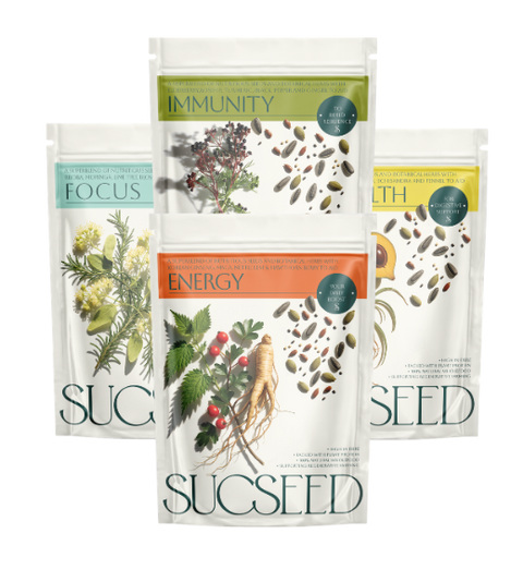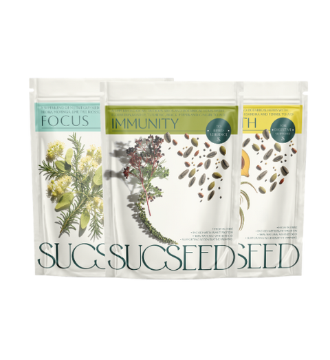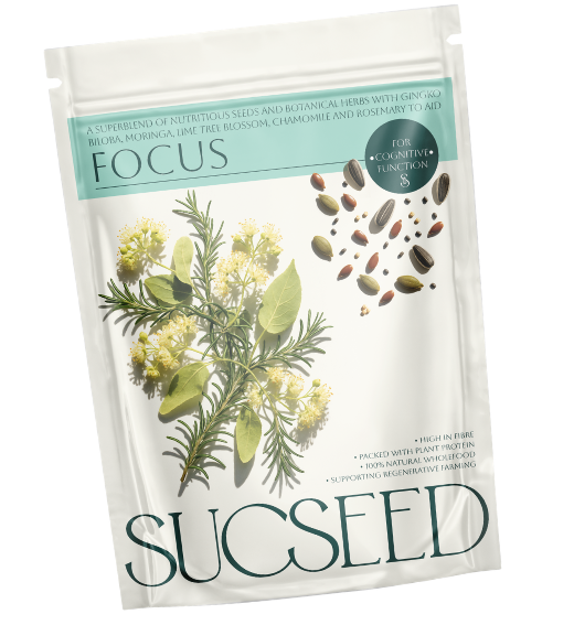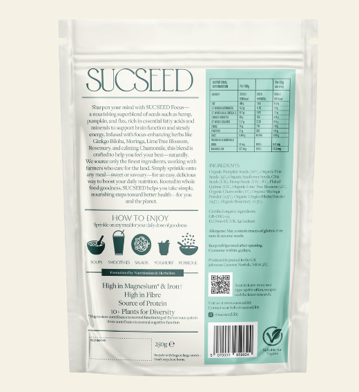 SUCSEED Focus is a blend of Flax, Chia, Pumpkin, Sunflower and Hemp seeds with Ginkgo Biloba, Moringa, Lime Tree Blossom, Chamomile and Rosemary. This blend is high in 10 Vitamins and Minerals including Zinc and Iron which contribute to normal cognitive function; alongside Potassium, Magnesium, Thiamine and Copper which contribute to the normal functioning of the nervous system. Sprinkle on yogurt or porridge, or add to smoothies, salads, soups, stews for a dose of wholefood goodness with every meal.